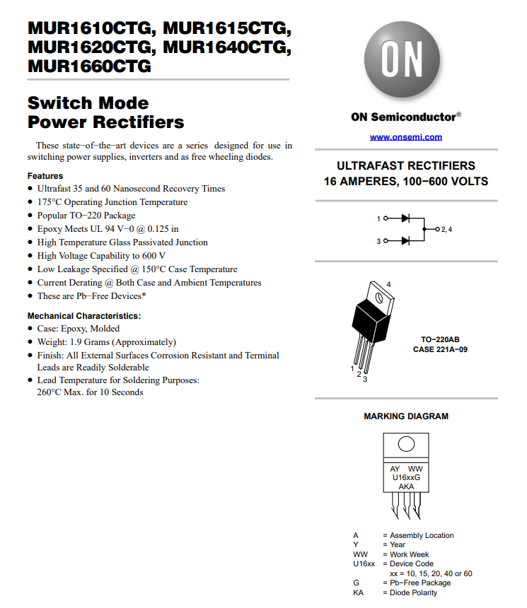 (1ตัว) [DIOD] UF DIOD MUR1660CTG ON/FSC 16A 600V