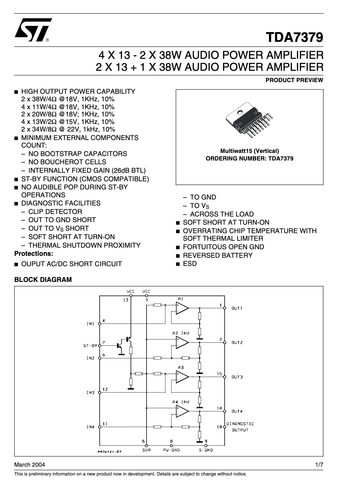 (1ตัว) [IC] TDA7379 ST 4x13 หรือ 2x38W Audio Power Amp
